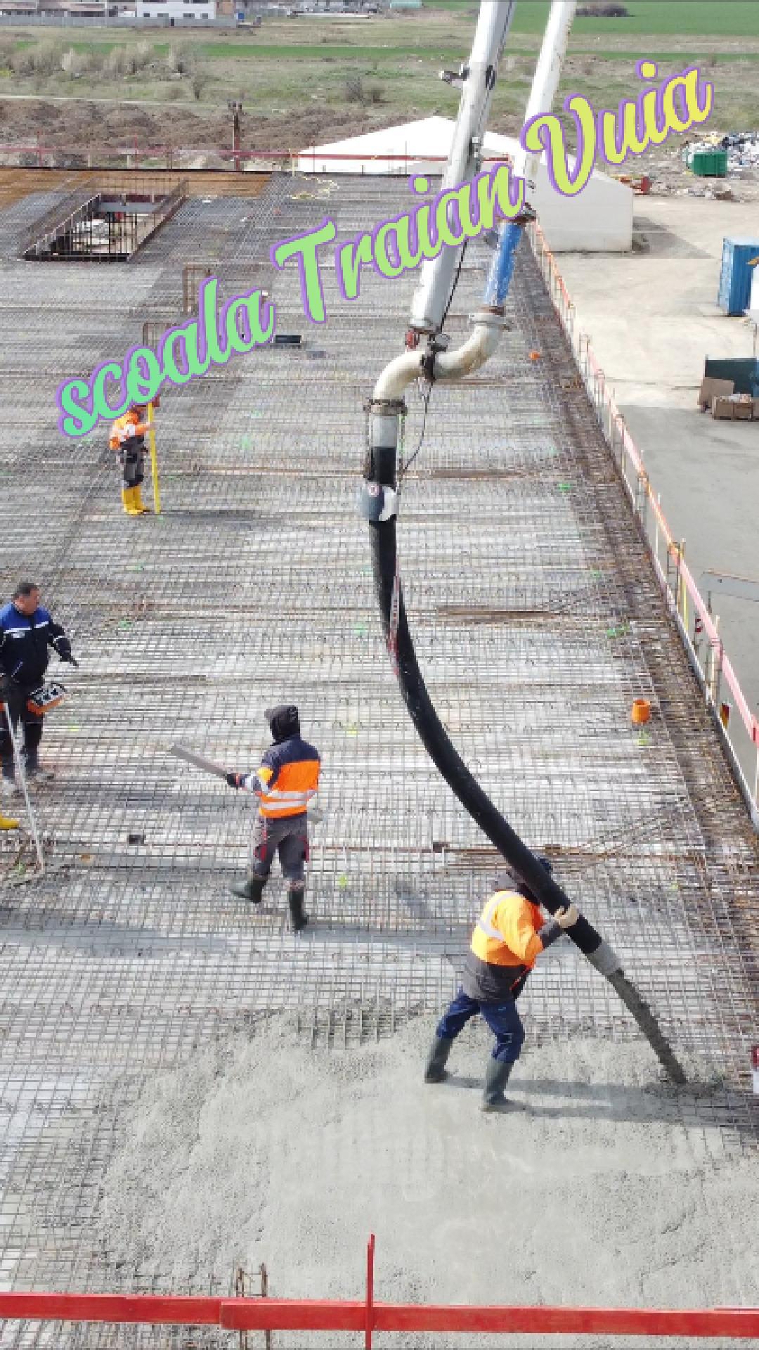 La corpul nou se toarnă structura de beton, placa de la etajul I: 20 de tone de fier și 120 de metri cubi de beton la o placă de 11 cm grosime.