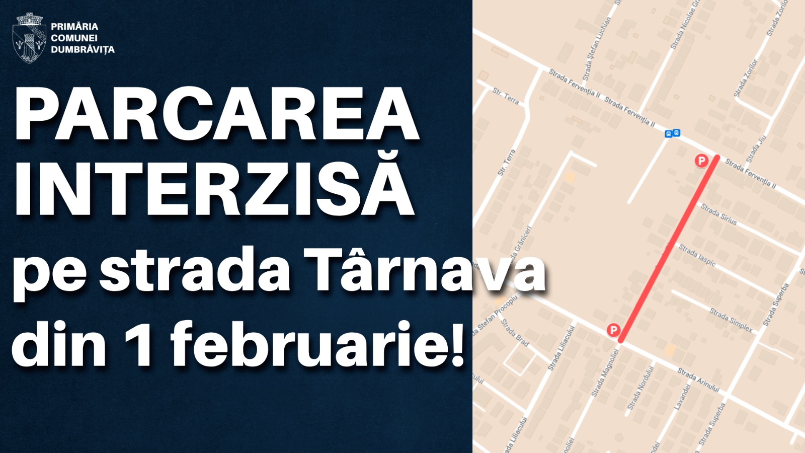 – Oprire interzisă pe strada Târnava (de la intersecția cu Fervenția II până la intersecția cu Arinului). Va fi montat și indicatorul rutier cu semnificația oprire interzisă și cu semnul adițional interval orar 07:00 – 19:00.